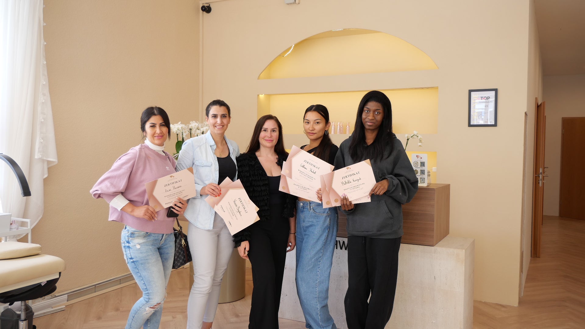 Dieses Zertifikat ist für dich ein echter Mehrwert, denn es schafft Vertrauen bei deinen zukünftigen Kundinnen. Wenn du dein Zertifikat sichtbar in deinem Studio aufhängst, vermittelst du sofort Professionalität, Kompetenz und Seriosität – ein entscheidender Vorteil gegenüber Mitbewerbern, die nur einfache, selbst erstellte Zertifikate ausstellen.